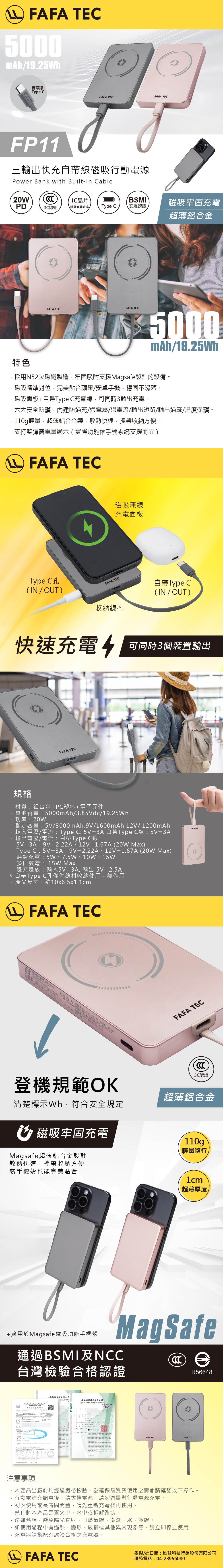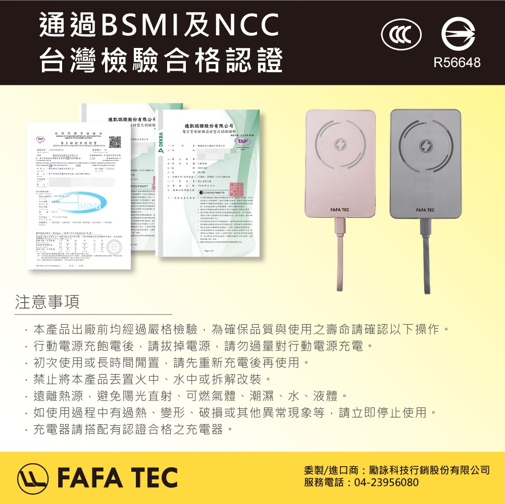 ■產品特色 BSMI認證:R56648 .採用N52釹磁鐵製造,牢固吸附支援Magsafe設計的設備。 .磁吸精準對位,完美貼合蘋果/安卓手機,穩固不滑落。 .磁吸面板+自帶Type C充電線,可同時3輸出充電。 .六大安全防護,內建防過充/過電壓/過電流/輸出短路/輸出過載/溫度保護。 .110g輕量,超薄鋁合金製,散熱快速,攜帶收納方便。 .支持雙彈窗電量顯示(實際功能依手機系統支援而異)